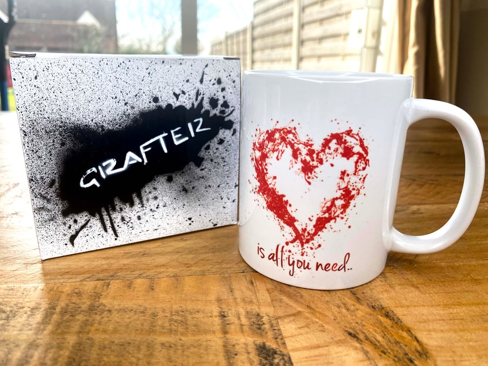 A quality 11oz ceramic coffee mug with a two high resolution images printed on either side and a "GRAFTER" tag across the centre.